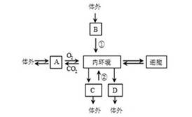 2、选择题 如下图,表示人体内的细胞与外界环境之间进行物质交换的过程,下列说法错误的是