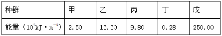 4、选择题 若一个相对封闭的生态系统中共有五个种群,其能量调查如下: