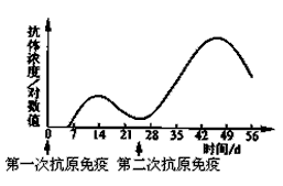 1、选择题 一般情况下,用抗原免疫机体,血清中抗体浓度会发生相应变化。如果在第二次免疫与第一次免疫所用的抗原相同且剂量相等,下列四图中能正确表示血清中抗体浓度变化的是