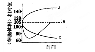 本题解析:试题分析:据曲线分析,A曲线细胞体积增加到一定不再增加,为处于清水,植物细胞吸收膨胀,到一定时间后水分出入平衡。B曲线细胞先试水,后吸水,为处于0.4mol/L的KNO3溶液中,一开始,细胞失水,一定时间后,由于离子通过主动运输不断进入液泡,增加细胞液浓度,重新吸收。C曲线代表细胞位于0.3mol/L的蔗糖溶液,细胞失水调节下降,到一定时间后,细胞液浓度和外界溶液浓度相当,水分出入平衡,细胞体积不再有较大变化。故C正确。