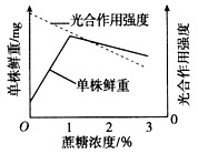 (4)将某植物试管苗培养在含不同浓度蔗糖的培养基上一段时间后,单株鲜重和光合作用强度的变化如上图。据图分析,随着培养基中蔗糖浓度的增加,光合作用强度的变化趋势是_________,单株鲜重的变化趋势是_______。据图判断,培养基中不含蔗糖时,试管苗光合作用产生的有机物的量_______(填“能”或“不能”)满足自身最佳生长的需要。