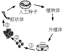 3、连线题 人工种子是人们模仿天然种子的结构制造出来的生命有机体,它能像天然种子一样萌发生长。人工种子的核心部分是被外层物包埋的具体类似种子胚功能的胚状体。胚状体不同于一般种子的胚,是由非合子细胞分化形成的类似于胚的结构物,所以又称“体细胞胚”或“花粉胚”。胚状体在一定的条件下,可以通过胚胎发育过程形成植株。胚状体可从悬浮培养的单细胞中得到,也可以通过试管培养的茎尖、芽尖、子房、花粉等获得。将胚状体包埋在一个能提供营养的胶质中,便成了所谓的“人工种子”。培育过程如下图所示。请根据以上材料回答: