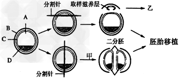 (2)甲过程代表的技术是_______,操作时的技术关键是_________,该技术在实践中的主要应用意义是___________;乙过程取滋养层可用于____________。