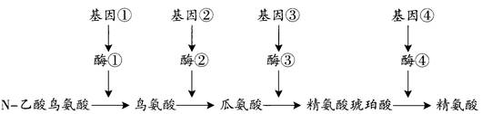 4、选择题 下图为脉胞霉体内精氨酸的合成途径示意图。从图中可得出