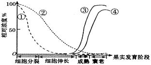 2、选择题 下图所示木瓜果实的发育过程中各阶段激素变化情况,其中①是细胞分裂素,②是生长素,③是乙烯,④是脱落酸,对此理解正确的是