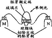 4、选择题 将等体积的两个琼脂块放置在胚芽鞘尖端的切面下,琼脂块中间用玻璃片纵向隔开,对胚芽鞘尖端进行单侧光照射,如图所示。关于这项实验结果的叙述正确的是