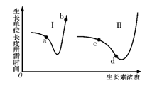 1、选择题 下图表示植物生长单位长度所需时间与生长素浓度的关系,下列叙述中,正确的