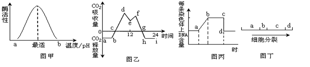 本题解析:试题分析:在图甲a点,低温仅是降低酶的活性,不能使酶失活,A错;在图乙,de段在坐标横轴之上,光合速率大于呼吸速率,B错;在图丙,造成cd段下降的原因是着丝点分裂,姐妹染色单体分开,C正确;在图丁,观察分生组织细胞染色体数目应该找b阶段即中期的细胞,D正确。故本题选CD。
