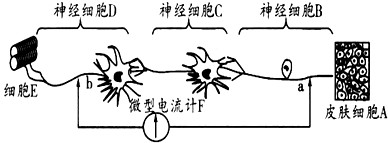 B.在细胞A处给予一个刺激,电流计的指针能发生两次方向相反的偏转