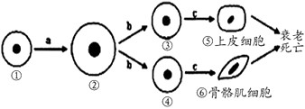 1、选择题 下图为人体细胞的分裂、分化、衰老和死亡过程的示意图,图中①~⑥为各个时期的细胞,a~c表示细胞所进行的生理过程。据图分析,下列叙述正确的是