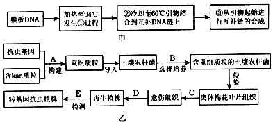 (2)在培育转基因植物的研究中,卡那霉素抗性基因(kan)常作为标记基因,只有含卡那霉素抗性基因的细胞才能在卡那霉素培养基上生长。乙图为获得抗虫棉技术的流程。A过程需要的酶有____、____。图中将目的基因导入植物受体细胞采用的方法是____。C过程的培养基除含有必要营养物质、琼脂和激素外,还必须加入____。