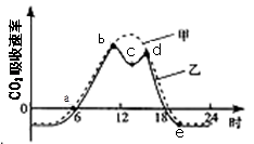 本题解析:试题分析:纵坐标中二氧化碳吸收速率表示的是该植物的净光合速率。a点时甲植株净光合速率为0,即光合速率与呼吸速率相等;乙植株在b-d段表现为CO2吸收,说明此时有机物积累量超过有机物消耗量;曲线bc段下降是因为叶片气孔关闭导致二氧化碳的供应不足,而d来源:91考试网 91ExaM.orge段下降是因为光照强度的减弱;bd段乙植株因蒸腾作用过于旺盛,气孔关闭,CO2供应不足,光合作用强度降低,甲植株固定CO2能力强,不发生光合午休的现象。