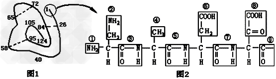 4、选择题 下面是某蛋白质的肽链结构示意图(图1,其中数字为氨基酸序号)及部分肽链放大图(图2),请据图判断下列叙述中正确的是