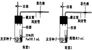 5、连线题 在科学研究中人们常用呼吸熵(RQ=)表示生物用于有氧呼吸的能源物质不同。测定发芽种子呼吸熵的装置如下图关闭活塞,在25℃下经20min读出刻度管中着色液移动的距离。设装置1和装置2的着色液分别向左移动x和y(mm),x和y值反映了容器内气体体积的减少。请回答: