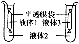 5、选择题 实验装置如下图所示,一段时间后,含液体3的半透膜袋萎缩,而含液体1的半透膜袋坚挺硬实,请推断实验开始时3种液体的浓度是(下表中的“高”表示高浓度蔗糖溶液,“低”表示低浓度蔗糖溶液)