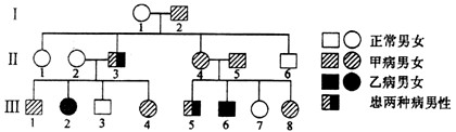 5、选择题 某家系中有甲、乙两种单基因遗传病(如下图),其中一种是伴性遗传病。相关分析错误的是