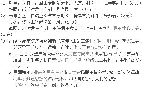 (2)结合所学知识指出,中国明清时期的早期启蒙思想家们提不出“新的社会方案”的根本原因。(2分)欧洲启蒙思想家为什么能够拿出“资产阶级的国家蓝图”?(2分)他们拿出了怎样的“蓝图”?(4分)