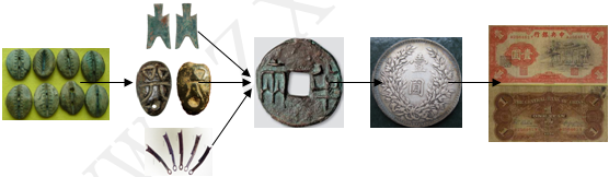 贝壳?铲币、蚁鼻、刀币?半两钱?银元?法币
