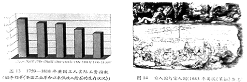 (2)材料二中图13,14反映了当时英国工人怎样的生存状况,揭示了什么社会问题?根据材料三,概括当时英国有识之士对上述问题的认识,并结合所学知识分析议会立法改善工人劳动条件的主要原因。
