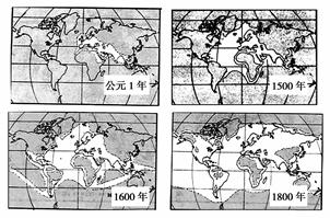 材料二 图中的四幅图摘自斯塔夫里阿诺斯《全球通史》(图中白色部分是西方人眼中的世界)