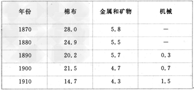5、判断题 下表为1870-1910年中国一些进口货物占总进口值的百分比,该表反映出