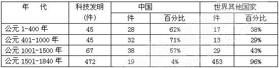 材料五 据英国学者罗伯特﹒坦普尔《中国——发明和发现的国度》一书统计,现代世界赖以建立的基本的发明创造,几乎有一半以上源于中国,如下表: