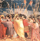 材料一 下图是乔托于1305——1306年创作的壁画《犹大之吻》。情景是:犹大上前亲吻耶稣,以此作为捉拿耶稣的暗号。因此,犹大的吻是出卖主的暗号,罪恶的吻。