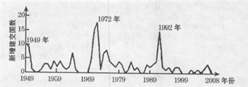 4、判断题 图是1949-2008年中国与外国建交情况曲线图。在下列各项中,建交最高峰出现的原因是