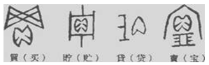 4、选择题 在殷墟贵族墓葬中发现了许多随葬的贝壳,甲骨文中也有如图所示的带“贝”的文字。这说明( )