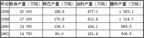 1、判断题 下面是“1958——1961年全国主要农产品产量统计表”,从表中可以看出,这一时期农产品产量总体上呈迅速下降趋势,其主要原因是
