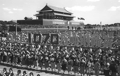 2、判断题 下图为天安门前由钢铁工人组成的国庆游行队伍,他们高举“为生产1070万吨钢而奋斗”的标语。该标语提出的背景是