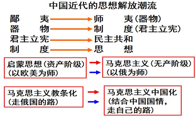 (2)结合所学,从“师夷长技以制夷”“师夷长技以自强”,到维新变法、追求民主共和、提倡民主和科学、接受马克思主义,从学造器物、仿行制度到提倡思想解放,不断探求强国之路。这是近代中国人向西方学习的渐进过程,也是近代中国人思想不断解放的过程。