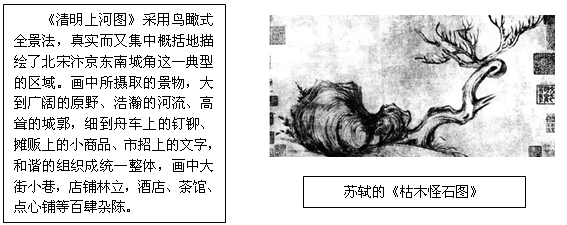 本题解析:(1)本题考查分析材料的能力,需要从材料中整合信息。结合教材的知识,我们知道宋代的画作主要是民俗居多,文人善画山水,因此风俗画和文人山水画盛行。这一切的文化现象与经济基础和政治特点是分不开的。我们需要从经济,政治,社会生活三个方面看待这个现象。