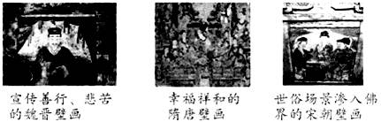 本题解析:魏晋时期社会动荡,人民流离失所,所以壁画宣传善行 表达现实悲苦;隋唐是我国封建社会的繁荣时期,政治比较清明,国力强盛所以壁画有一派幸福和祥和的气象,宋朝时期,商品经济发展,市民阶层壮大,所以壁画能反映市民阶层的喜好,世俗场景由之入画。所以选B