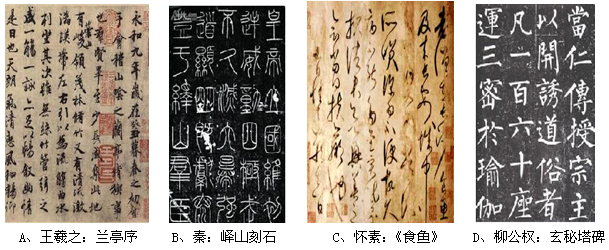 5、选择题 书法艺术是中华民族传统文化的瑰宝。“起来向壁不停手,一行数字大如斗。恍恍如闻神鬼惊,时时只见龙蛇走,左盘右蹙如惊电,状同楚汉相攻战。湖南七郡凡几家,家家屏障书题遍。”李白的这首诗赞颂的是