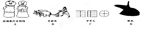 A、殷墟刑具陶俑 B 牛耕图 C 甲骨文 D 铁犁
