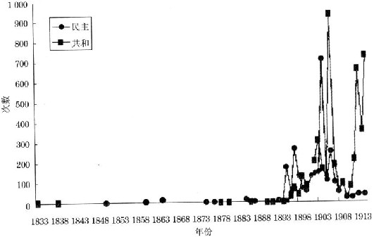 “共和”“民主”在1833—1913年的出现的频率度统计