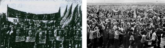 图一 1966年哈尔滨学生在广场游行?图二 1984年北大学生在国庆游行