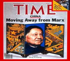 材料二 下图所示是美国《时代》杂志1985年某一期的封面。画面很清楚地对毛泽东和邓小平两个时代的生活进行了对比:一边是游行的队伍和农民在田里插秧;另一边是忙忙碌碌的上班族,高楼大厦,汉堡包、照相机等消费品。