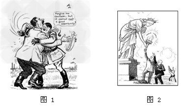 (1)图1漫画上有两个人物:希特勒和斯大林。希特勒拥抱的同时,在斯大林的背上狠狠地插上了一刀!图中的文字是:“原谅我,同志,但这个机会实在太诱人了。”结合漫画和所学知识评价《苏德互不侵犯条约》。