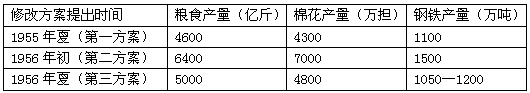 3、判断题 ? 我国在制订“二五计划”的目标时,对粮食、棉花、钢铁产量的预定目标进行了反复修改。下表是从