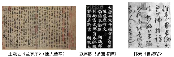 本题解析:本题考查多中国书法发展的认识。根据材料中所给的三幅图片,我们可知:第一幅图片是东晋大书法家王羲之的作品,王羲之的《兰亭序》有“天下第一行书”的美誉;颜真卿是唐代的大书法家,他的《多宝塔碑》是楷书的典范;怀素是草书大家,他的草书轻盈飘逸,富有动感。因此本题选择C选项。
