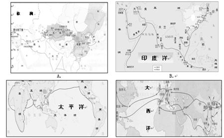 3、选择题 若忽略图形比例,下列四幅地图中大致描绘了宋朝对外贸易路线的是