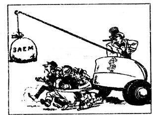 材料四 漫画“美国最新式战车’’(1947年发表于苏联某杂志,图中俄文“3AEM”意为财政贷款)
