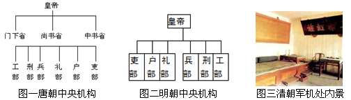 (1)图1体现的中国古朝王朝政治制度的基本特征是什么?与图1相比,图2反映的政治制度发生变化的主要原因是什么?图3中军机处的设置反映了中国封建社会的什么政治特点?综合上述图示,说明中国古朝政治制度演变的趋势。(8分)