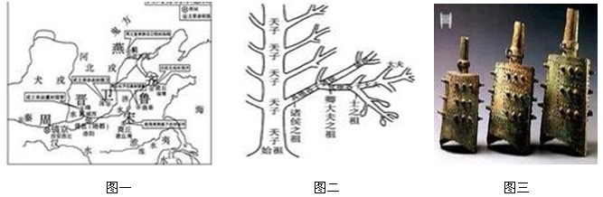 本题解析:(1)本题考察学生对图片信息的解读能力,难度适中。根据图一所示,图中出现了同姓封国和异姓封国,如晋、燕、魏、宋等;再根据所学知识可知:分封制度也叫封邦建国,是在保证周王室强大的条件下,将宗族姻亲和功臣分派到各地,广建封国,叫做诸侯;以达到“授土”“授民”,建立了一批新兴国家,周人势力范围不断扩大;确立天下共主的地位,统治效果得到加强;图二则反映了宗法制度,即形成周天子—诸侯—卿、大夫-士”的等级序列,形成大小宗之间的关系;图三主要是青铜编钟,是一种乐器,主要是维护封建制度而与之相配套的文化制度,通过礼乐制度来规范贵族的身份地位,要求贵族在衣、食、住、行等方面都要符合自己的身份,贵贱长幼之间要有明显的差别。