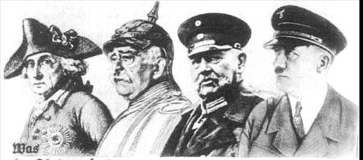 材料三?美国一家图书馆收藏着《第三帝国重建德意志昔日光辉的宣传海报》(下图),有美国人认为海报中从左至右第一人为华盛顿,其余依次为俾斯麦、兴登堡、希特勒。