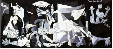 艺术品不能直接证史,但艺术品却能反映历史。此画名《格尔尼卡》,是西班牙画家毕加索作于20世纪30年代的一件具有重大影响及历史意义的杰作,曾在联合国安理会悬挂24年。画中表现的是1937年德国空军地毯式疯狂轰炸西班牙小城格尔尼卡的暴行。