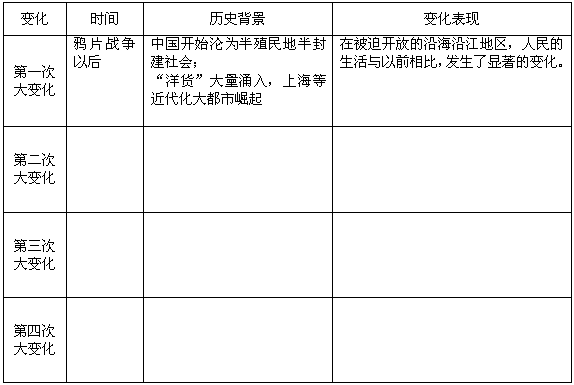 4、判断题 近现代以来,社会生活的每一次大的变化,都与特定的历史背景有关联。请简要说明近现代以来我国人民四次大的社会生活变迁的历史大背景及其主要表现。请按照示例“第一次变化”。填写下表: