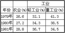4、判断题  下表反映了1979——1981年我国农业、轻工业和重工业在工农业总产值中所占比重的变化情况。导致这一时期国民经济比例发生变化的主要原因是
